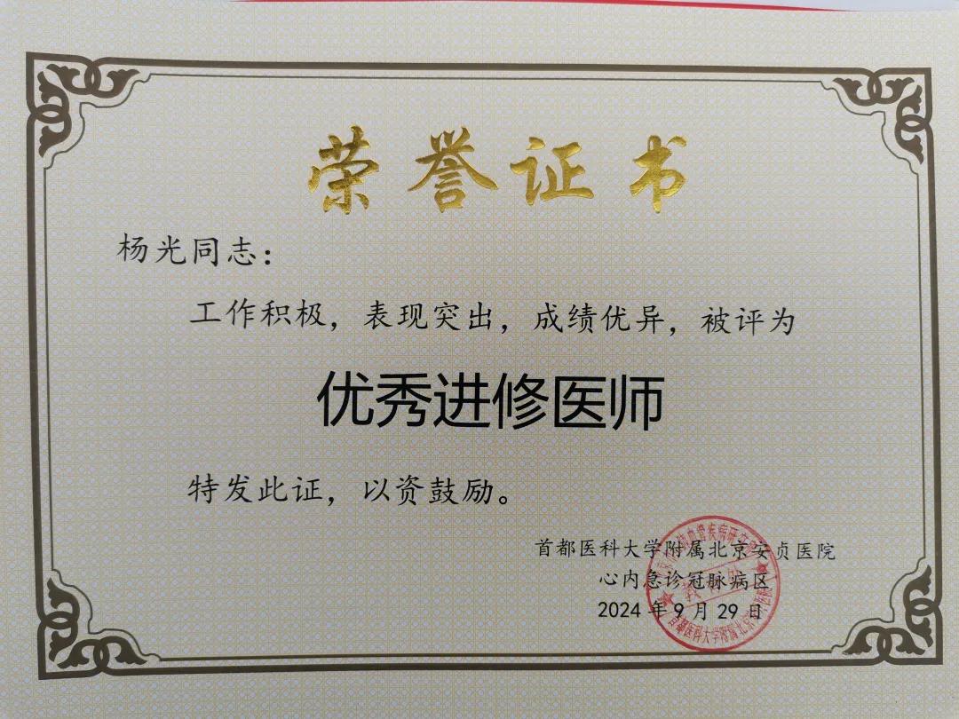 近日,市二院心血管內(nèi)科主治醫(yī)師楊光在首都醫(yī)科大學附屬北京安貞醫(yī)院完成為期一年的進修學習,現(xiàn)順利結(jié)業(yè)、學成歸來,因在進修期間表現(xiàn)優(yōu)異,被評為北京安貞醫(yī)院“優(yōu)秀進修醫(yī)師”榮譽稱號,不僅為醫(yī)院全體青年醫(yī)師樹立了榜樣,同時也給醫(yī)院心內(nèi)科專業(yè)發(fā)展注入新的活力,將所學轉(zhuǎn)化為生產(chǎn)力,把新知識、新技術傳播開來,讓更多患者受益。