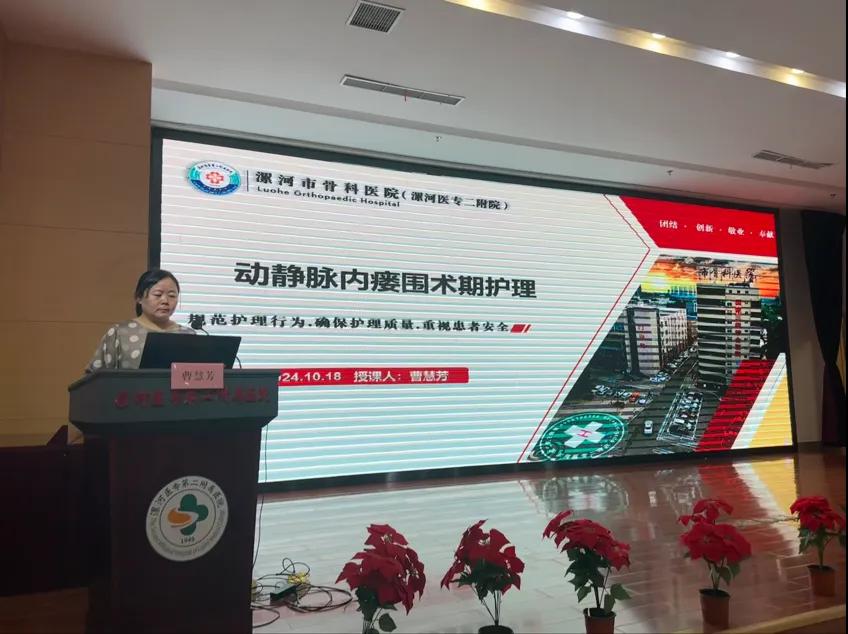 精心的圍手術(shù)期護(hù)理,可以減少手術(shù)并發(fā)癥,提高手術(shù)成功率,曹慧芳主任以《動(dòng)靜脈內(nèi)瘺圍術(shù)期護(hù)理》為題詳細(xì)闡述了患者評(píng)估與準(zhǔn)備、手術(shù)過(guò)程與護(hù)理配合、術(shù)后護(hù)理與觀(guān)察、藥物治療與護(hù)理、心理護(hù)理等內(nèi)容。