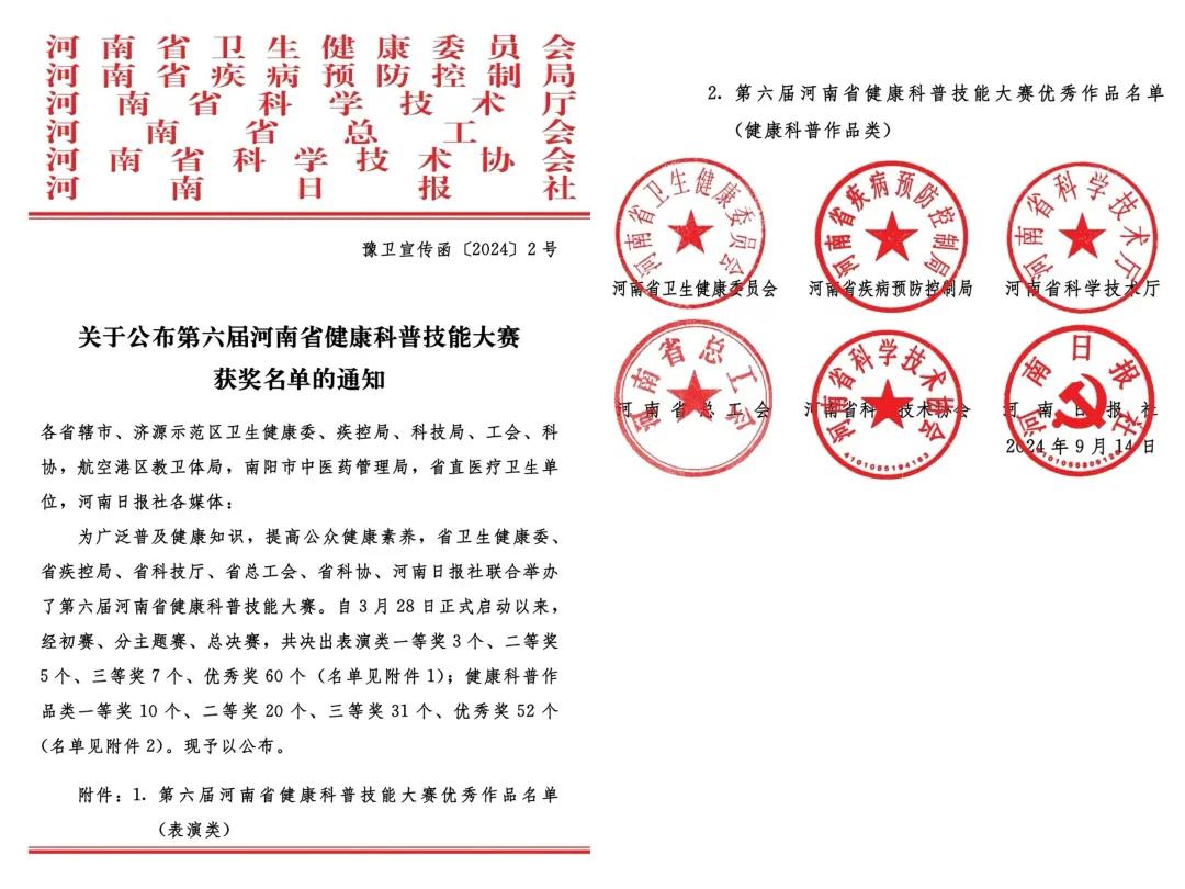 近日,由河南省衛(wèi)生健康委、河南省疾病預(yù)防控制局、河南省科技廳、河南省總工會(huì)、河南省科協(xié)、河南日?qǐng)?bào)社聯(lián)合主辦、河南省疾病預(yù)防控制中心、大河健康報(bào)聯(lián)合承辦的第六屆河南省健康科普技能大賽圓滿落下帷幕。
