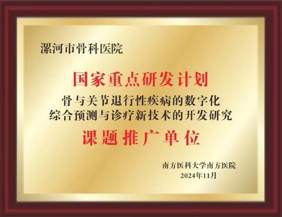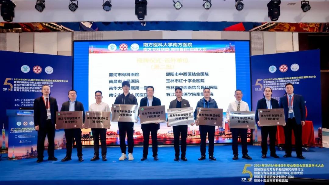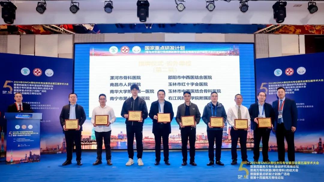 11月22日—24日,由廣東省醫(yī)學(xué)教育協(xié)會、南方醫(yī)科大學(xué)南方醫(yī)院脊柱骨科聯(lián)合主辦,廣東省醫(yī)學(xué)教育協(xié)會脊柱外科專業(yè)委員會承辦的“2024年GMEA脊柱外科專業(yè)委員會第五屆學(xué)術(shù)大會”在廣東廣州成功舉行。在南方專科聯(lián)盟(脊柱骨科)啟動大會暨國家重點研發(fā)計劃推廣活動上,漯河市骨科醫(yī)院(漯河醫(yī)專二附院、漯河市立醫(yī)院)榮獲“國家重點研發(fā)計劃-骨與關(guān)節(jié)退行性疾病的數(shù)字化綜合預(yù)測與診療新技術(shù)的開發(fā)研究課題推廣單位”與“南方專科聯(lián)盟單位(脊柱外科)”雙項授牌!