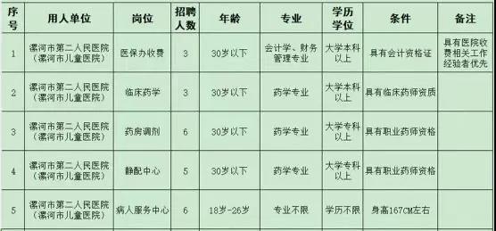 漯河市第二人民醫(yī)院(漯河市兒童醫(yī)院)因工作需要,需委托第三方以勞務(wù)派遣形式公開招聘醫(yī)保辦收費、臨床藥學(xué)、藥房調(diào)劑、靜配中心、病人服務(wù)中心等崗位人員共計23名,具體如下: