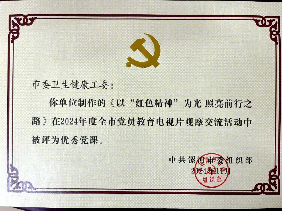 近日,中共漯河市委組織部開展的2024年度全市黨員教育電視片觀摩交流活動獲獎名單新鮮出爐,市二院藥學黨支部報送的微視頻《以“紅色精神”為光 照亮前行之路》被評為優(yōu)秀黨課。