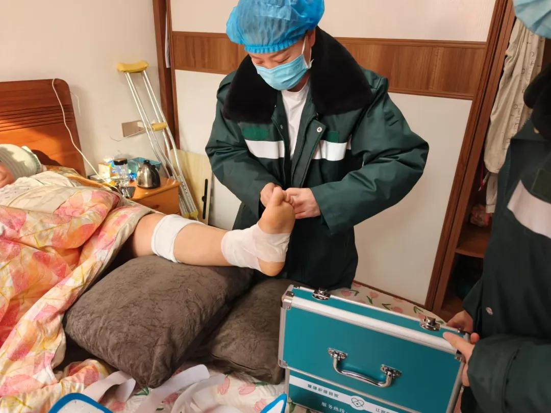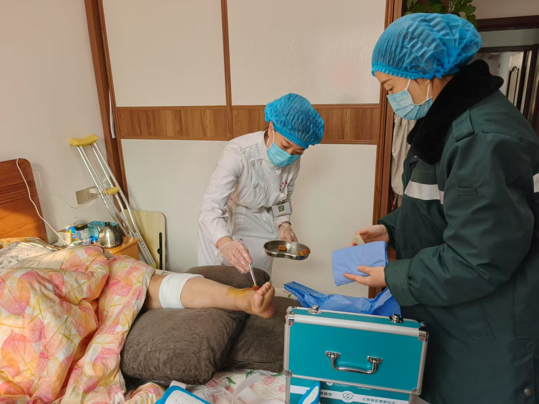 接到任務(wù)后,張燕燕護(hù)士長帶領(lǐng)科室主管護(hù)師孟丹丹一起按照約定時(shí)間上門服務(wù),在對患者做了系統(tǒng)的傷口評估后,嚴(yán)格按照操作標(biāo)準(zhǔn),動(dòng)作輕柔又利落地對傷口進(jìn)行了創(chuàng)面消毒、換藥、包扎,同時(shí)耐心為患者及家屬講解了傷口居家護(hù)理的注意事項(xiàng)及患肢的功能鍛煉要點(diǎn)等。
