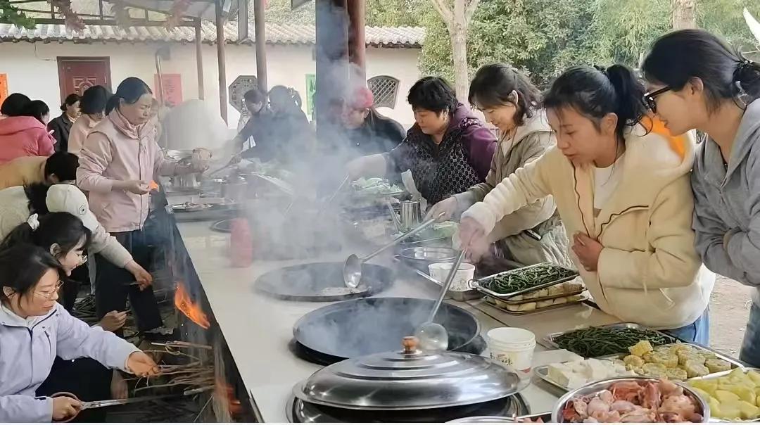 傍晚時(shí)分,炊煙裊裊。女職工們圍爐執(zhí)鏟,分組協(xié)作烹制自助地鍋,分工堪比手術(shù)室配合:有人專(zhuān)業(yè)控火如醫(yī)囑級(jí)“文火轉(zhuǎn)中火”,有人顛勺翻炒展現(xiàn)“無(wú)菌操作”式利落。柴火灶前翻炒聲、歡笑聲交織成趣。此刻,沒(méi)有無(wú)影燈與監(jiān)護(hù)儀,只有星辰煙火映笑顏。