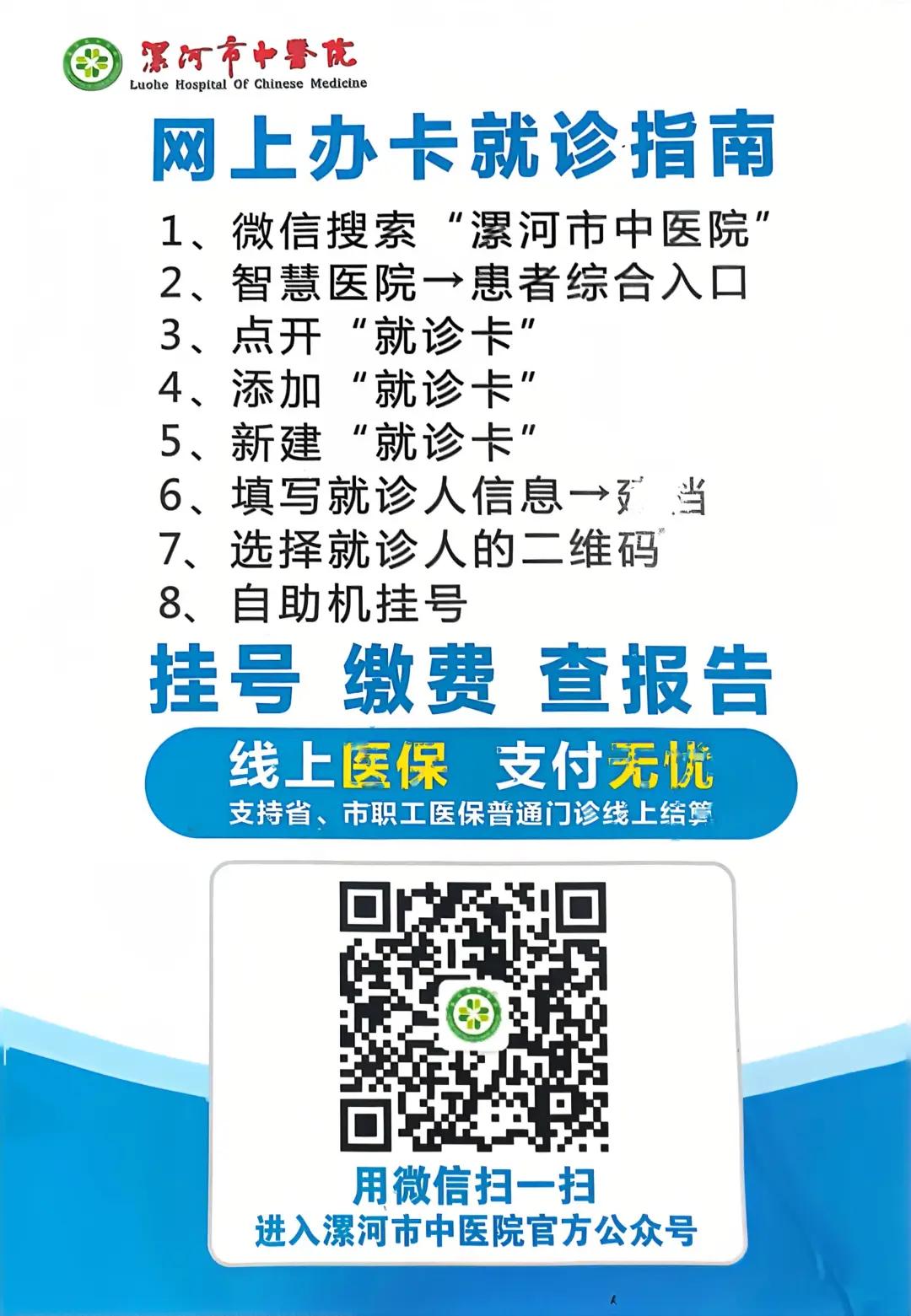 2、預(yù)約掛號:子女或親屬可幫助老年人通過醫(yī)院微信公眾號(如“漯河市中醫(yī)院公眾號”)或者支付寶小程序線上預(yù)約掛號。