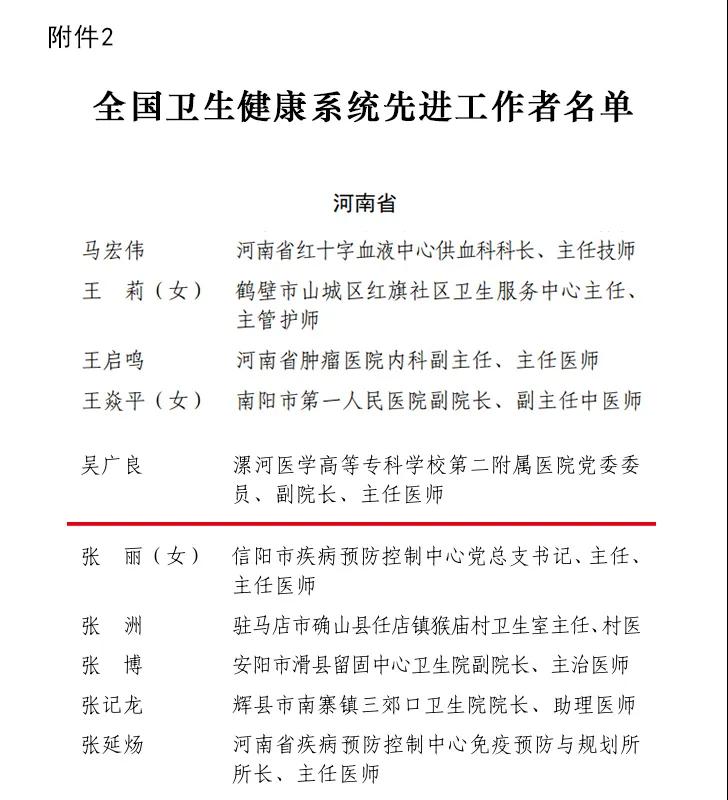 漯河醫(yī)專二附院吳廣良教授榮獲“全國衛(wèi)生健康系統(tǒng)先進(jìn)工作者”稱號
