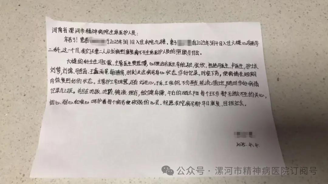 漯河市精神病醫(yī)院:一封感謝信——愛與責任的回響