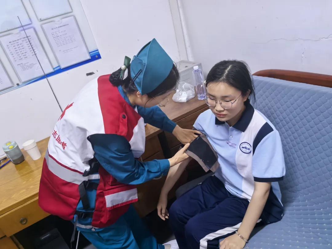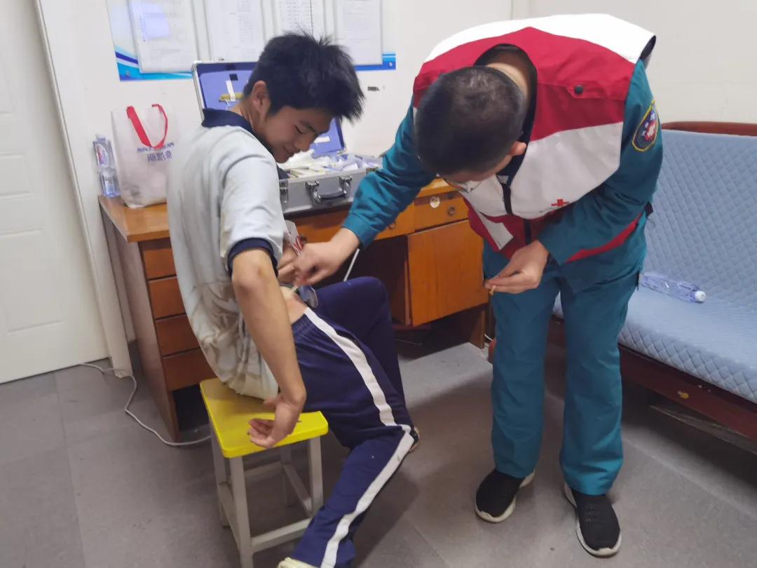 運(yùn)動會期間,志愿者穿梭于賽場的各個(gè)角落,化身“移動急救站”,時(shí)刻關(guān)注著運(yùn)動員的狀態(tài)。一旦接到求助,他們迅速到達(dá)現(xiàn)場,對傷員進(jìn)行初步診斷和處理,為擦傷運(yùn)動員細(xì)心消毒包扎,為身體不適學(xué)生及時(shí)測量血壓、補(bǔ)充電解質(zhì)飲品。面對突發(fā)扭傷學(xué)生,志愿者第一時(shí)間進(jìn)行專業(yè)評估與固定處理,贏得師生一致好評。