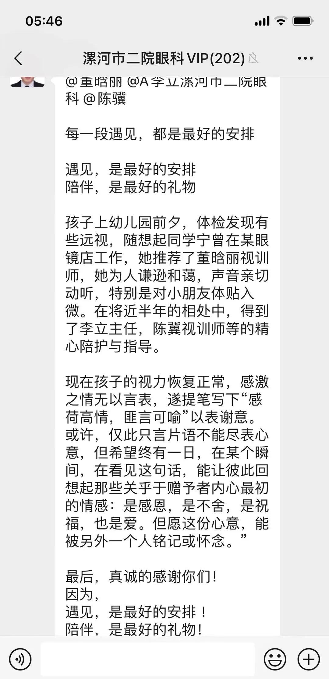 經(jīng)過半年多的康復訓練,祺寶雙眼視力均提升到了該年齡段的正常水平0.5。祺寶的爸爸非常激動,為了表達對市二院眼科視覺康復中心全體醫(yī)護人員的感激之情,他親手創(chuàng)作了兩幅字畫,并在微信群發(fā)送了感謝信,代表了家長對醫(yī)護人員的深深敬意,更見證了市二院眼科團隊在視覺康復領域的專業(yè)與付出。