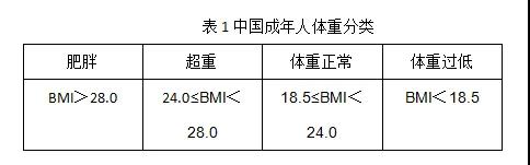 體重變化是判斷一段時期內(nèi)能量平衡與否最簡便易行的指標(biāo),也是判斷吃動是否平衡的指標(biāo)。目前常用的判斷健康體重的指標(biāo)是體質(zhì)指數(shù)(body massindex, BMI),它的計算方法是用體重(kg)除以身高(m)的平方。我國健康成年人(18~64歲)的BMI應(yīng)在18.5~23.9 kg/m2(表1),65歲以上老年人的適宜體重和 BMI應(yīng)該略高(20~26.9kg/m2)。