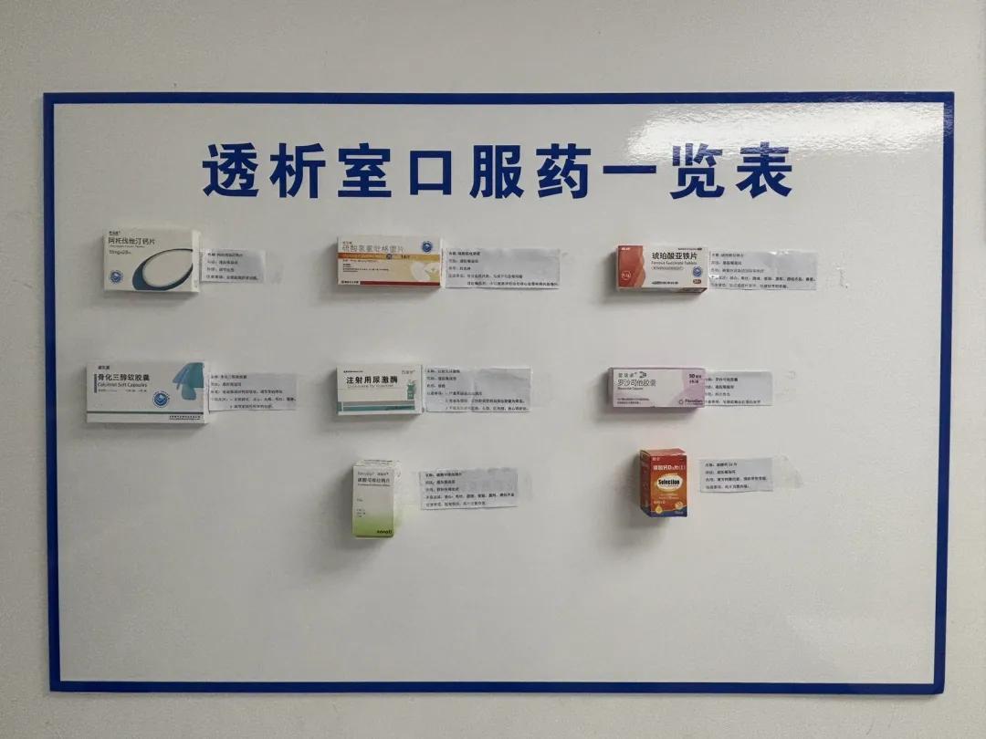 隨著醫(yī)學技術的發(fā)展,高齡患者越來越多,即便醫(yī)護人員反復講解用藥方法,患者和家屬仍可能因記憶模糊、理解偏差導致用錯藥。為了解決這一難題,血液凈化室推行 “口服藥上墻” 舉措,患者可以拿著自己藥盒與墻上的藥盒進行一一對照。藥盒旁配有詳盡說明,圖文并茂,直觀易懂,有效避免用藥誤區(qū),確?;颊哂盟幇踩?,提升治療效果。