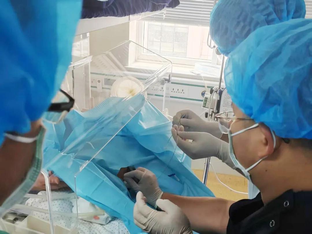 新生兒團隊立即更換無創(chuàng)呼吸機為“有創(chuàng)呼吸機”高頻震蕩通氣(減少肺損傷),呼吸困難仍未緩解,血氧飽和度維持在85%左右,立即聯(lián)系胸外科劉鵬濤主任緊急會診。在仔細查看患兒情況后,劉鵬濤診斷患兒為氣胸,需行胸腔穿刺閉式引流術(shù),排氣緩解呼吸困難,立即準備進行麻醉、行右側(cè)胸腔穿刺置管,負壓引流排氣。穿刺成功瞬間,水封瓶內(nèi)氣體“嘶嘶”排出,壓縮的肺重新張開,約5分鐘后患兒呼吸困難明顯緩解,膚色轉(zhuǎn)紅潤,血氧飽和度上升至95%左右,一根細細的引流管緩解了危機,大家心里終于松了一口氣。