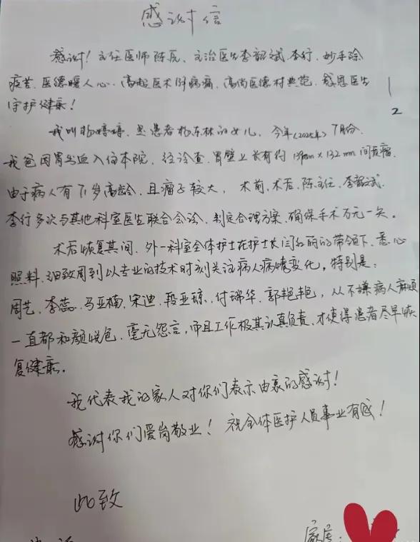 這封感謝信,是對普通外科全體醫(yī)護人員,尤其是對護理團隊辛勤付出和專業(yè)精神的高度認(rèn)可與鼓勵。對團隊而言,患者的康復(fù)和家屬的滿意是他們最大的追求。普通外科團隊將繼續(xù)秉承“以患者為中心”的服務(wù)理念,不斷精進醫(yī)療技術(shù),提升護理服務(wù)質(zhì)量,尤其是加強復(fù)雜、高齡患者圍手術(shù)期的精細化、人性化護理管理,用精湛的醫(yī)術(shù)祛除病痛,用溫暖的仁心守護健康,為更多患者帶來康復(fù)的希望和家的溫暖。(盧 闖 閆紅麗 劉 旭 袁錦鈺)