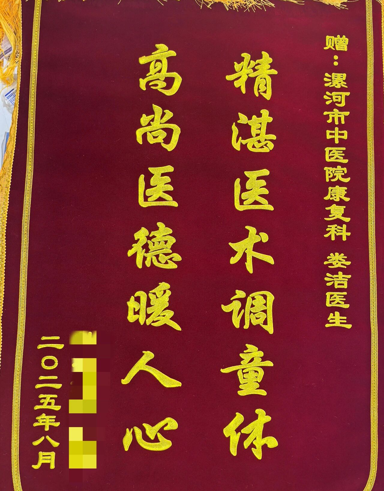 近日,漯河市中醫(yī)院兒童康復科收到患兒家屬贈送的兩面錦旗,分別寫有 “杏林飄香贊醫(yī)德,仁心仁術好醫(yī)生”“精湛醫(yī)囑調(diào)童體,高尚醫(yī)德暖人心”。家屬以此表達對婁潔醫(yī)生、王莉護士長及治療師精湛技術和優(yōu)質(zhì)服務的肯定與感謝。