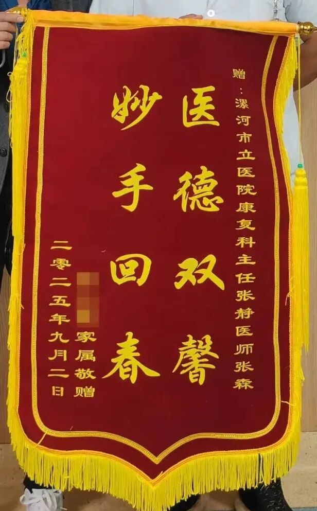 “醫(yī)德雙馨,妙手回春”——這面沉甸甸的錦旗,被患者鄭重地送到了漯河醫(yī)專二附院(漯河市骨科醫(yī)院、漯河市立醫(yī)院)康復(fù)醫(yī)學(xué)科張森醫(yī)生手中 ,這是患者對(duì)張醫(yī)生真摯的肯定,更是一段從絕望到重生的康復(fù)之路的見證。 一個(gè)半月前,患者因偏癱陷入困境:左側(cè)肢體完全活動(dòng)不利,神志不清、胡言譫語(yǔ),溝通障礙,記憶功能受損,生活無(wú)法自理。康復(fù)醫(yī)學(xué)科團(tuán)隊(duì)立即制定個(gè)性化方案,中西醫(yī)結(jié)合開啟康復(fù)征程。
