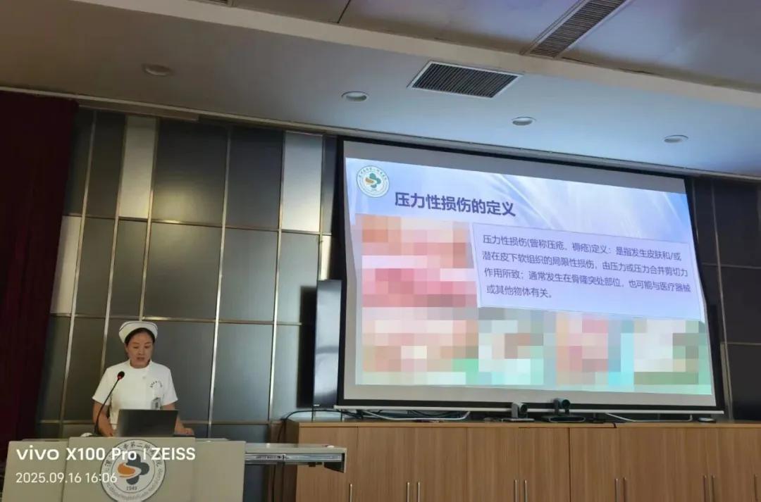 培訓(xùn)伊始,壓力性損傷/傷口護(hù)理學(xué)組會(huì)診干預(yù)組長張燕燕老師帶來關(guān)于《新型敷料在壓力性損傷中的應(yīng)用》的主題分享。她結(jié)合大量臨床案例,細(xì)致講解了各類新型敷料的材質(zhì)特性、適用場(chǎng)景,以及壓力性損傷不同分期對(duì)應(yīng)的敷料選擇策略、操作規(guī)范和效果評(píng)估方法。從水膠體敷料到泡沫敷料,從藻酸鹽敷料到銀離子敷料,張老師一一剖析,讓參訓(xùn)人員對(duì)新型敷料的臨床應(yīng)用有了更精準(zhǔn)、全面的認(rèn)識(shí),為科學(xué)選擇和使用敷料提供了堅(jiān)實(shí)理論支撐。