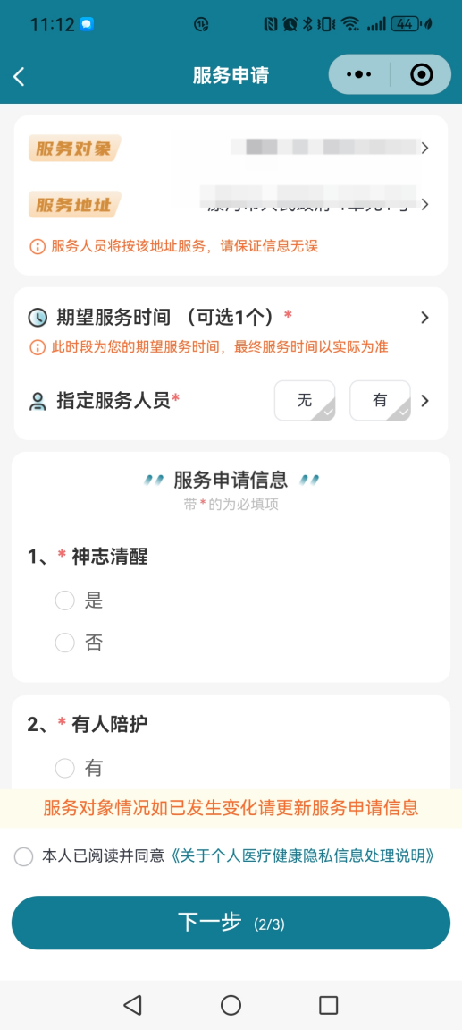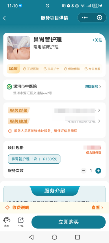 3、選擇項目規(guī)格,填寫“服務對象”信息與“服務地址”(首次使用需實名認證)