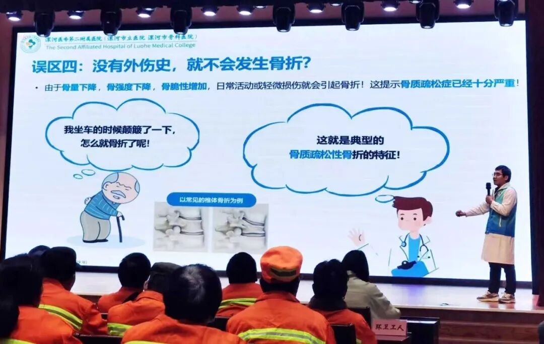 活動(dòng)中,漯河醫(yī)專(zhuān)二附院骨科專(zhuān)家王松茂聚焦10月20日“世界骨質(zhì)疏松日”主題,針對(duì)基層群眾尤其是環(huán)衛(wèi)工人的工作特點(diǎn),開(kāi)展骨質(zhì)疏松專(zhuān)題健康科普講座。講座內(nèi)容貼合群眾需求,從骨質(zhì)疏松的成因、早期癥狀、預(yù)防方法到日常養(yǎng)護(hù)要點(diǎn),進(jìn)行了通俗細(xì)致的講解,幫助群眾建立科學(xué)的骨骼健康認(rèn)知,為預(yù)防骨質(zhì)疏松奠定基礎(chǔ)。
