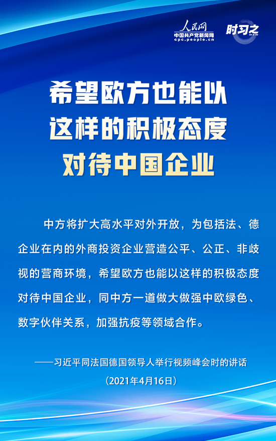 4月16日下午,國家主席習(xí)近平在北京同法國總統(tǒng)馬克龍、德國總理默克爾舉行中法德領(lǐng)導(dǎo)人視頻峰會。三國領(lǐng)導(dǎo)人就合作應(yīng)對氣候變化、中歐關(guān)系、抗疫合作以及重大國際和地區(qū)問題深入交換意見。人民網(wǎng)·中國共產(chǎn)黨新聞網(wǎng)“時習(xí)之”欄目摘錄了習(xí)近平在這次視頻峰會上的重要講話內(nèi)容,一起學(xué)習(xí)。
