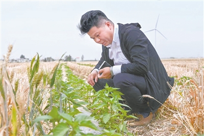 王偌飛在田間察看辣椒苗長勢(資料圖片)。圖片由王偌飛提供