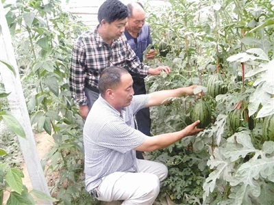 徐電超(前)與村民在大棚里察看西瓜長勢。