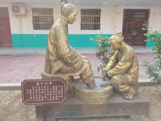這是辦公區(qū)域。二樓以上是學(xué)生宿舍,樓梯口處的花壇花開得鮮艷而濃烈;孟子盡孝的雕像立在這里,栩栩如生······