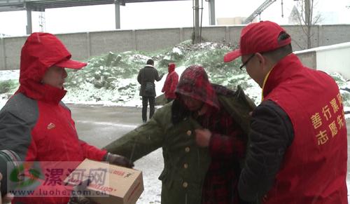下午三點(diǎn)半,市救助管理站專門組成救助隊(duì)上街展開市區(qū)巡查。由于氣溫比較低,街頭行人較少,為 了能夠及時(shí)發(fā)現(xiàn)流浪人員,救助隊(duì)在火車站附近徒步尋找。 在市區(qū)人民路清真寺附近,救助站工作 人員發(fā)現(xiàn)了一位拄著拐杖穿著單薄的拾荒老人。經(jīng)過救助站工作人員簡(jiǎn)單詢問,得知老人是平頂山市 葉縣人,來漯河已經(jīng)五六天了,但由于家庭原因,他不愿意回家,也不愿意去救助站。救助站工作人 員看到老人穿著單薄的棉衣,腳上的布鞋也已經(jīng)被雪水打濕,隨即給老人從車上拿來了軍大衣和棉鞋 御寒,并幫忙為老人穿上。下午四點(diǎn)鐘,救助隊(duì)根據(jù)熱心市民撥打的求助電話,尋找到一位在外流浪 的婦女,由于該婦女不能清楚的表述自己的家庭地址和姓名年齡,工作人員第一時(shí)間給她穿上御寒的 棉衣棉鞋后,將她送往就近的救助安置點(diǎn)進(jìn)行妥善安置。