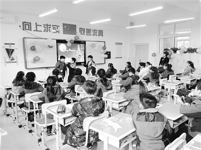 在教學(xué)樓二樓的三(1)班教室,記者看到教室內(nèi)被學(xué)生們用氣球裝扮起來(lái),班里正在舉行活動(dòng)。3位同學(xué)正在教室前方表演自己編排的話(huà)劇,幽默的臺(tái)詞和滑稽的動(dòng)作,惹得班里的同學(xué)和老師哈哈大笑。