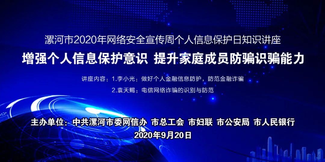 為推動漯河市網絡安全宣傳周個人信息保護日主題活動深入開展,結合生活中個人金融信息、電信信息容易被竊取的問題,幫助廣大家庭成員提升金融詐騙、電信網絡詐騙的防騙識騙能力,中共漯河市委網信辦、市總工會、市婦聯、市公安局、市人民銀行聯合舉辦“保護個人信息安全、提升防騙識騙能力”直播授課。