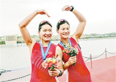 呂揚(yáng)(右)與隊(duì)友張靈拿下2020年全國(guó)賽艇錦標(biāo)賽首金。