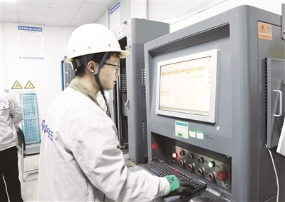 平漯周高鐵中鐵五局站前四標(biāo)項(xiàng)目部中心試驗(yàn)室鋼筋力學(xué)室內(nèi),試驗(yàn)員正在對螺紋鋼筋物理力學(xué)性能進(jìn)行檢測。記者 范子恒 攝