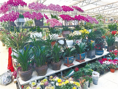 隨后,記者到柳江路金三角花卉市場(chǎng)采訪。市場(chǎng)內(nèi),蝴蝶蘭、發(fā)財(cái)樹(shù)、長(zhǎng)壽花等顏色明艷、寓意吉祥的花卉被擺在顯眼位置。人們?nèi)宄扇?,在花卉綠植間穿梭、選購(gòu)。除了鮮花、綠植,一些做工精美、寓意美好的仿真花卉和用仿真花飾做成的福桶也很受歡迎。“福桶是最近幾年興起的,以紅色為主基調(diào),非常喜慶,適合春節(jié)擺在家中,深受消費(fèi)者喜愛(ài)。”店主駱先生介紹。