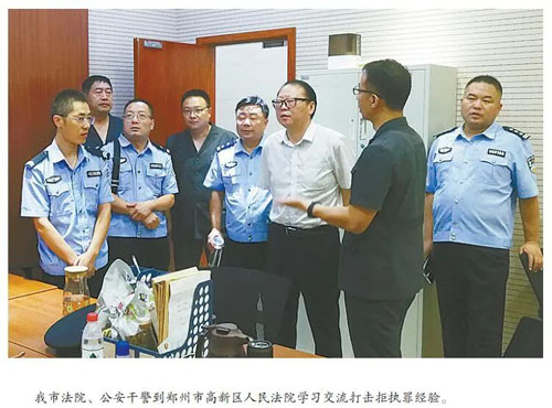 警務室成立以后,市中級人民法院黨組成員、副院長任國云牽頭組織成立了由執(zhí)行局、刑事法庭和公安民警共同參加的學習先進經(jīng)驗小組,分別到焦作市溫縣人民法院、商丘市柘城縣人民法院、鄭州市新密市人民法院等全國、全省執(zhí)行工作先進單位考察學習,汲取打擊拒執(zhí)罪先進經(jīng)驗、對照工作找差距、彌補執(zhí)行短板,針對我市實際,制訂了一套“法院+公安”的協(xié)同作戰(zhàn)方案,并建立了信息共享、溝通反饋、組織協(xié)調(diào)、督辦檢查等執(zhí)行聯(lián)動工作機制。