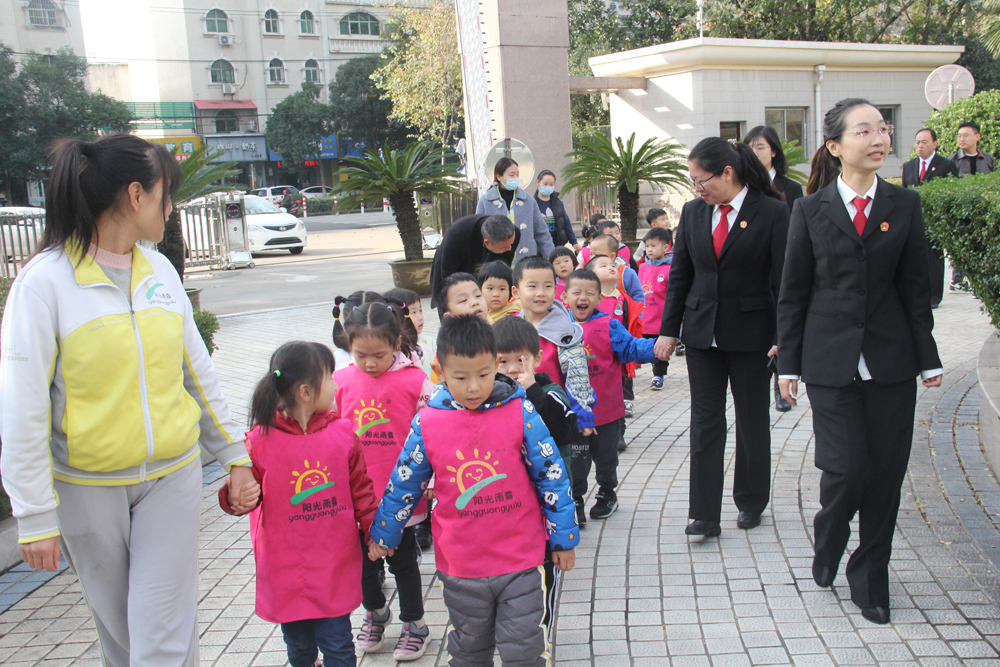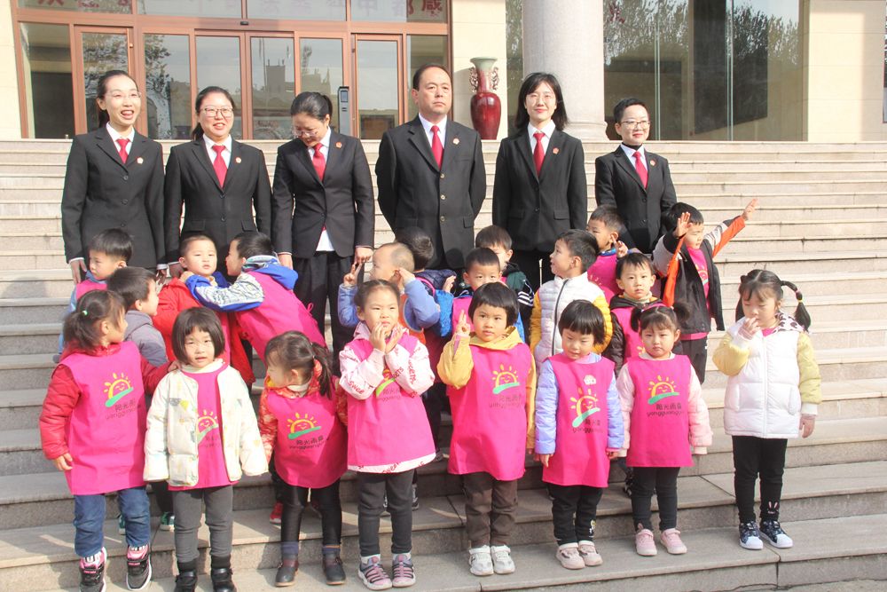 (中院法官和陽(yáng)光雨露幼兒園小朋友在大樓門(mén)前留影)