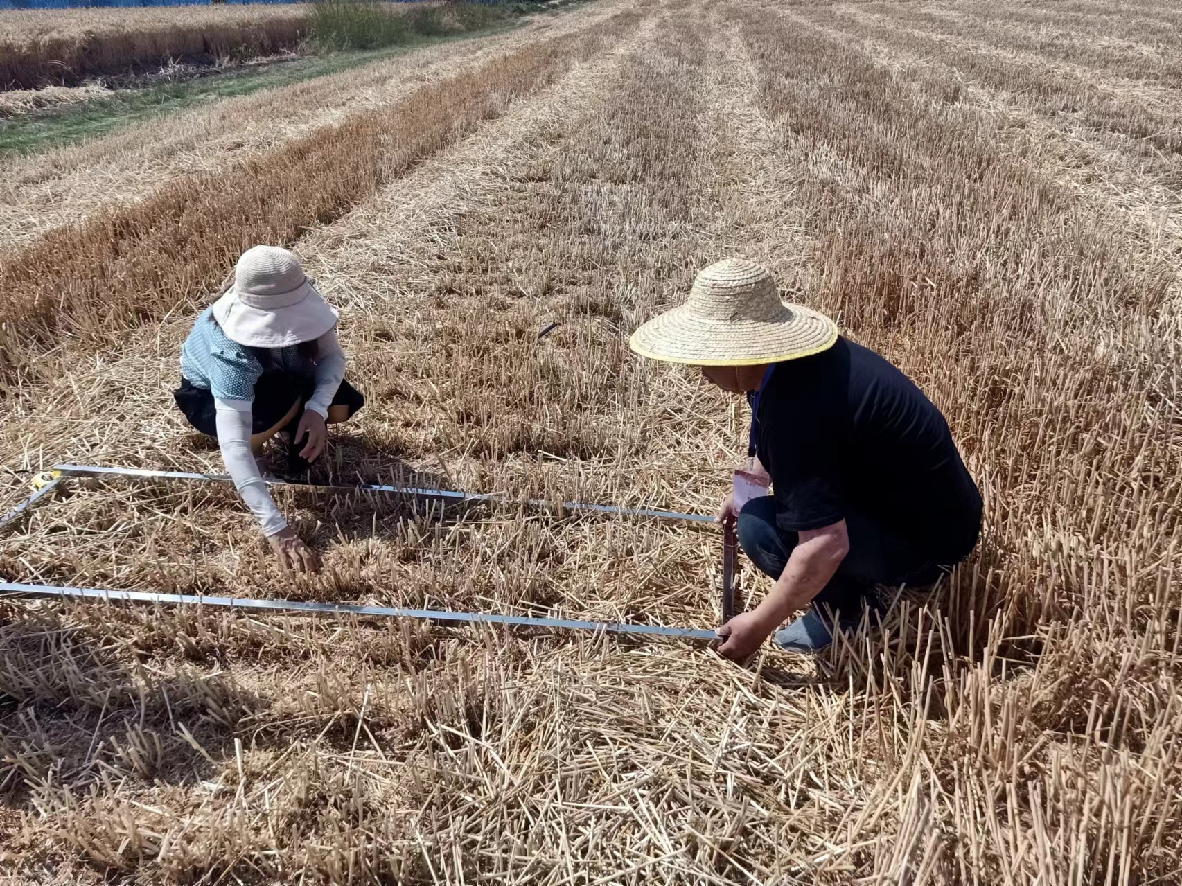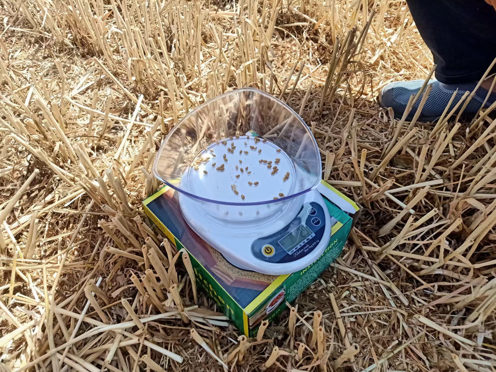 待機(jī)手收割完畢后,由區(qū)農(nóng)業(yè)機(jī)械技術(shù)中心的技術(shù)員和專家、村干部、村民代表和農(nóng)機(jī)操作手組成的評(píng)審組迅速進(jìn)場(chǎng),隨機(jī)卡點(diǎn)并用取樣袋收集測(cè)區(qū)內(nèi)掉落在地面的麥粒,隨后,把撿起的麥拉放在電子天平上進(jìn)行各自稱重,測(cè)算誰(shuí)機(jī)收漏籽少、留茬低。通過(guò)對(duì)比武田塊小麥產(chǎn)量技術(shù)檢測(cè)表明:小麥產(chǎn)量普遍在1300斤左右(只是部分地塊小麥?zhǔn)斋@時(shí),小麥籽粒含水率稍高)。小麥?zhǔn)斋@損失率平均小于等于0.89%。遠(yuǎn)小于國(guó)家規(guī)定的2%。