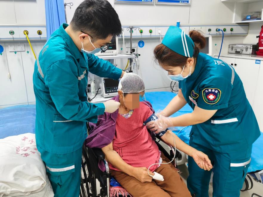 7月16日,大雨不停歇,該院急診科全天出車近20次。有的路段水深難行,醫(yī)務(wù)人員淌水到病人家中,第一時間為患者診治。在急診室內(nèi),急診醫(yī)生為外傷患者包扎傷口后詢問患者情況,護士長段銳為患者測量生命體征。