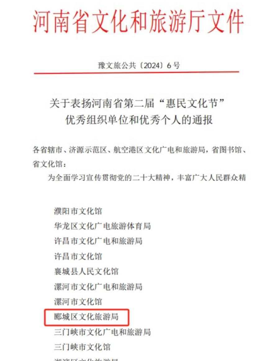 近期,在河南省文化和旅游廳公布的《關(guān)于表?yè)P(yáng)河南省第二屆“惠民文化節(jié)”優(yōu)秀組織單位和優(yōu)秀個(gè)人的通報(bào)》中,郾城區(qū)文化旅游局獲優(yōu)秀組織獎(jiǎng),局黨組書(shū)記、局長(zhǎng)李小青榮獲“優(yōu)秀個(gè)人”稱號(hào),這既是對(duì)郾城區(qū)惠民文化工作的充分肯定和贊揚(yáng),更是對(duì)今后文化工作的鼓勵(lì)與鞭策。