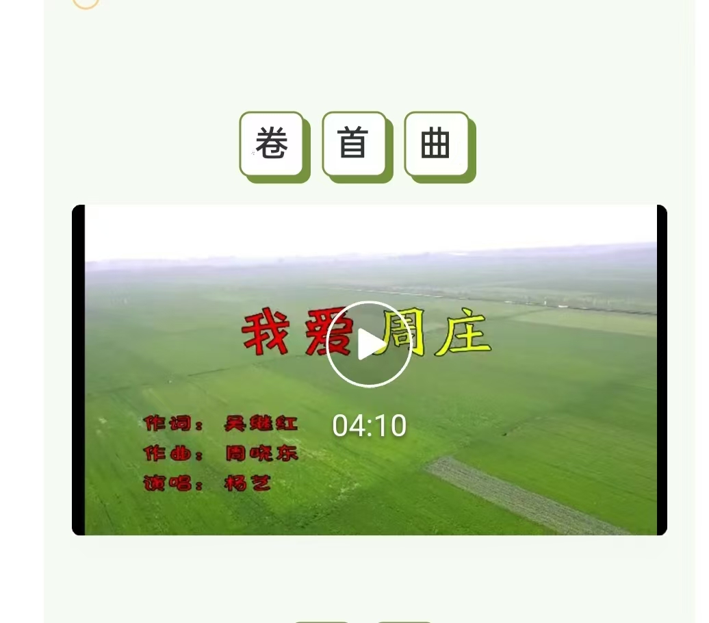 歌曲《我愛周莊》詞作者源匯區(qū)文化館吳繼紅,曲作者是原市音樂家協(xié)會主席周曉東,演唱者源匯區(qū)實(shí)驗(yàn)學(xué)校音樂老師楊藝。歌曲融入鄉(xiāng)村特色,運(yùn)用了中國民族調(diào)式,將周莊村的秀美風(fēng)光、村民勤勞勇敢的精神風(fēng)貌充分展現(xiàn)。歌詞富有詩意、旋律優(yōu)美,唱出了周莊村鄉(xiāng)村振興的美麗樂章,唱出了老百姓對當(dāng)下生活的滿足和對美好未來的期待,更唱響了周莊人的自豪感,凝聚了鄉(xiāng)情,成為鄉(xiāng)村文化的新符號。