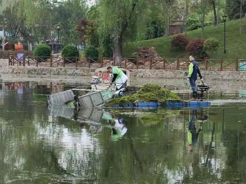 工作人員用機(jī)械船打撈水草及湖面漂浮物