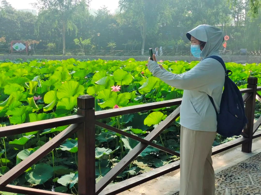 靜待盛綻:共盼千朵荷香滿園。此刻的公園荷塘,雖暫是"小荷才露尖尖角"的嬌羞模樣,卻已蘊(yùn)藏著盛夏"接天蓮葉無窮碧"的勃勃生機(jī)。往年,20余畝荷葉美景讓人流連忘返:碧波之上,蓮葉如蓋,層層疊疊鋪向遠(yuǎn)方,織就一湖翠色錦緞;千朵荷花競相綻放,粉白嬌妍,亭亭玉立,恰似仙子凌波;微風(fēng)過處,荷香浮動(dòng),彌漫了整個(gè)湖畔。身著漢服的姑娘們,手執(zhí)團(tuán)扇,巧笑嫣然,在荷塘邊、曲橋上留下衣袂飄飄的倩影,人與花相映成趣。環(huán)湖步道上,游人如織,攝影快門聲此起彼伏。更有孩童們指著盛開的荷花興奮不已,老人們則在樹蔭下?lián)u著扇子,笑看這滿塘的熱鬧與生機(jī)。待今年粉白花瓣全然舒展,六片花盞托著金盤玉蕊,醉人的荷香將再次漫溢環(huán)湖步道。