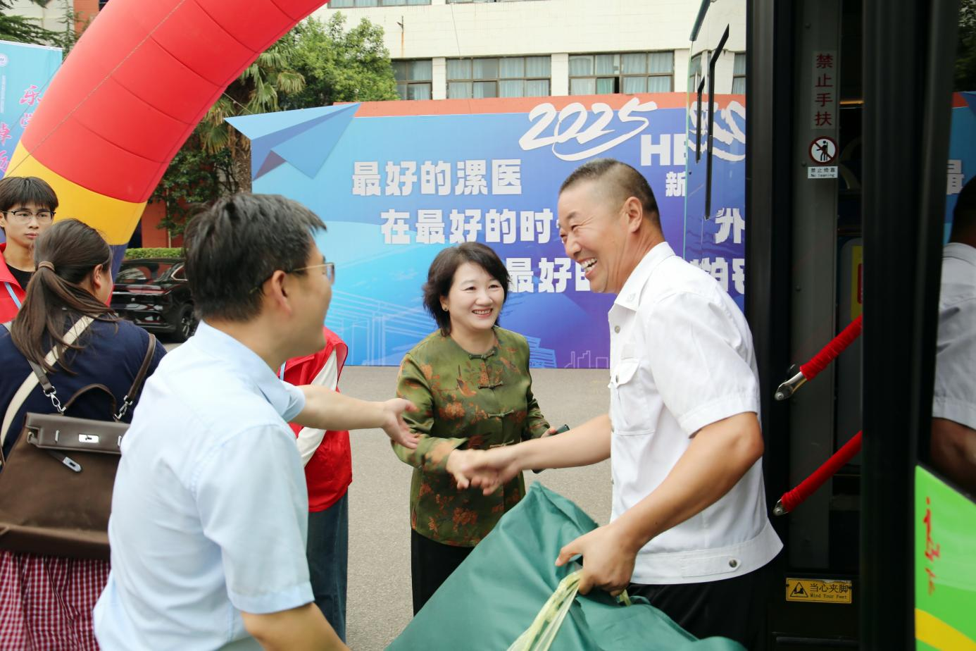青春乘秋風(fēng),壯志啟新程。8月30日,漯河醫(yī)專迎新工作全面拉開帷幕,上午8時,校長張祎捷、校黨委副書記邊曉峰分別帶領(lǐng)校領(lǐng)導(dǎo)班子深入源匯校區(qū)、召陵校區(qū)迎新現(xiàn)場,迎接第一輛駛?cè)胄@的新生班車,親切看望2025級新生及家長,并慰問一線工作人員和志愿者。