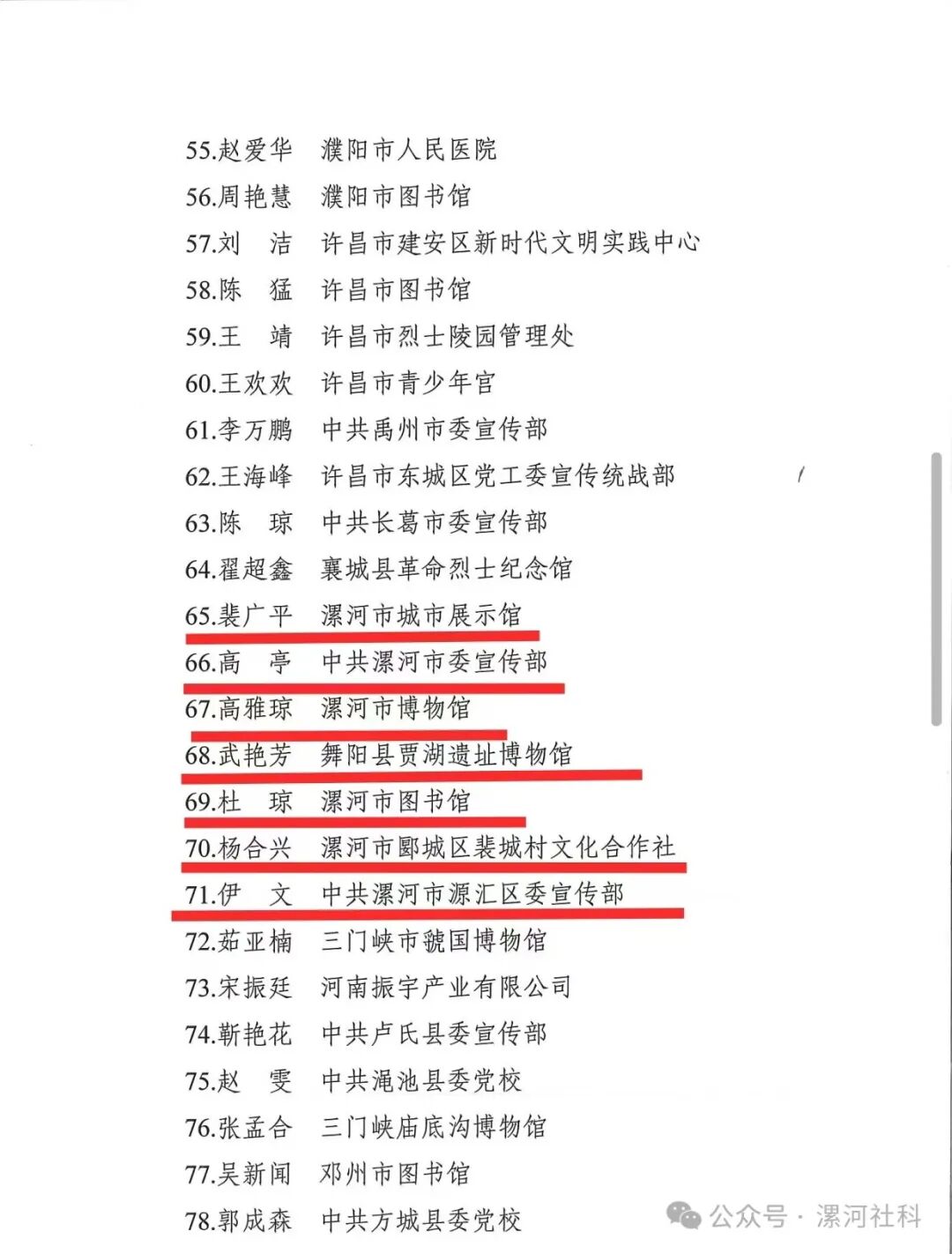 2024年社科普及志愿服務(wù)活動(dòng)表現(xiàn)突出社科普及指導(dǎo)員(7名):裴廣平(漯河市城市展示館);高亭(中共漯河市委宣傳部);高雅瓊(漯河市博物館);武艷芳(舞陽(yáng)縣賈湖遺址博物館);杜瓊(漯河市圖書館);楊合興(漯河市郾城區(qū)裴城村文化合作社);伊文(中共漯河市源匯區(qū)委宣傳部)