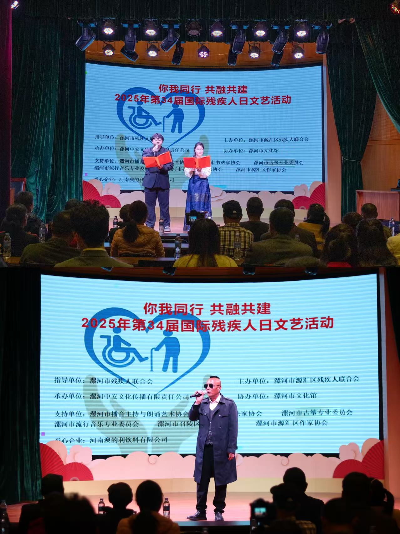活動(dòng)現(xiàn)場(chǎng),文藝展演精彩紛呈、暖意融融。廿一弦古箏社李巖帶來(lái)古箏演奏《這世界這么多人》,清泉般的旋律撥動(dòng)人心;漯河小學(xué)學(xué)生代表劉若涵演唱《心同此愿》,用純凈歌聲傳遞共通的情感與希望;盲人樂(lè)團(tuán)崔秋紅、周運(yùn)動(dòng)分別獻(xiàn)上戲曲《府門外三聲炮》與歌曲《愛(ài)的世界只有你》,展現(xiàn)出殘疾人朋友對(duì)藝術(shù)的執(zhí)著與生命的熱忱。朗誦節(jié)目同樣感染力十足,《詩(shī)意中國(guó)》《這盛世如您所愿》《相信未來(lái)》等作品,在漯河市播音主持與朗誦藝術(shù)協(xié)會(huì)成員的演繹下,既抒發(fā)了家國(guó)情懷,也傳遞了對(duì)美好生活的向往,漯河市流行音樂(lè)專業(yè)委員會(huì)代表鄭世杰演唱的《揮揮手》,更以灑脫旋律詮釋了直面人生的勇氣。