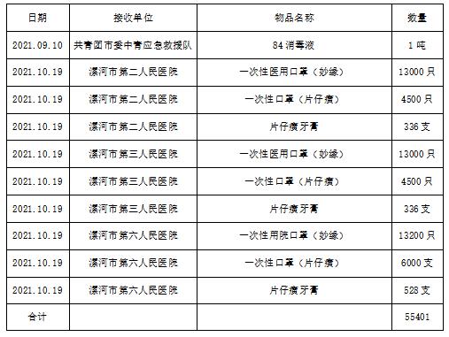 截止到10月19日20時,漯河市新冠肺炎疫情防控指揮部累計收到社會捐贈款物價值13,661,498.4元,其中捐贈物資價值5,575,623.88元,現(xiàn)將接受社會捐贈款物支出分配情況公示如下: