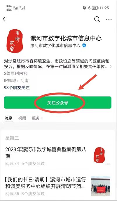 在微信搜索欄中搜索“漯河市數字化城市信息中心”或通過掃描二維碼關注公眾號。關注微信公眾號后,首先打開手機GPS定位功能。