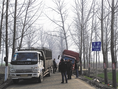 一座年久失修的危橋上設(shè)置了非常明顯的禁行標(biāo)志,但是貨車仍從橋上駛過,不禁讓人揪心。這是記者1月8日在何冢路塔河橋上看到的一幕。
