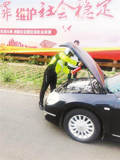 “看到他的車著了火,我就帶著摩托車上的滅火器和同事陳凱一起趕了過去。將火撲滅后,又把電瓶線拆掉,防止危險發(fā)生。”市交警支隊秩序管理大隊騎警中隊騎警陳彬說,事發(fā)時,他和同事陳凱正在附近執(zhí)行任務。