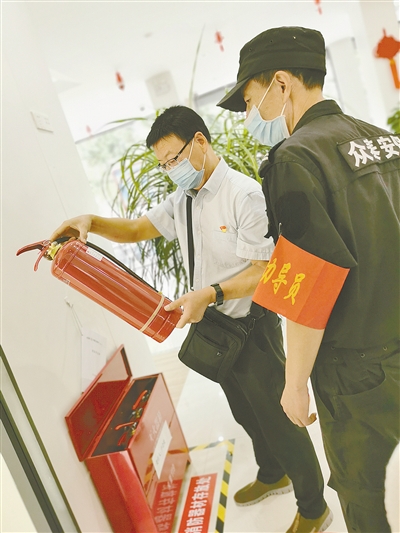 吳國安(左)正在銀行營業(yè)大廳檢查滅火器。