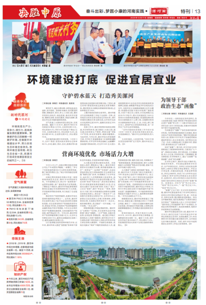 “十三五”時期,漯河市委、市政府高舉習(xí)近平新時代中國特色社會主義思想偉大旗幟,堅持以黨的建設(shè)高質(zhì)量推動經(jīng)濟(jì)發(fā)展高質(zhì)量,凝心聚力、砥礪前行,攻堅克難、奮勇爭先,致力以漯河更加精彩為中原更加出彩增添濃彩,高質(zhì)量發(fā)展邁出堅實步伐。漯河市成為全省唯一四獲國務(wù)院大督查表揚(yáng)的地級市,成功創(chuàng)建第六屆全國文明城市,被評為2020中國宜居宜業(yè)城市,居民幸福感穩(wěn)居全省第一……“十三五”規(guī)劃各項目標(biāo)任務(wù)即將完成,全面建成小康社會勝利在望,經(jīng)濟(jì)高質(zhì)量發(fā)展、社會高效能治理、群眾高品質(zhì)生活的美好畫卷正在徐徐展開。