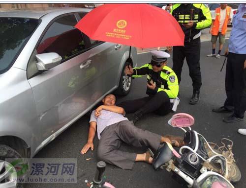 漯河市交警支隊(duì)秩序管理示范大隊(duì)騎警吳沛洋:當(dāng)時(shí)我跟隊(duì)友王冰潔巡邏到嵩山西支路的時(shí)候,發(fā)現(xiàn)一場車禍,我們立即上去查看,當(dāng)時(shí)發(fā)現(xiàn)地上躺了一位六十多歲的老人,經(jīng)過簡單的詢問老人出現(xiàn)了頭暈,胸悶的癥狀,根據(jù)經(jīng)驗(yàn)確定他有可能是心臟病,因?yàn)楫?dāng)時(shí)天氣溫度較高, 地表溫度可能要達(dá)到四十多度,老人心臟病不能移動(dòng),只能平躺,我就把老人的頭稍微抬起來一點(diǎn),由于沒有支撐點(diǎn),情急之下我就坐在地上伸出腿,讓老人枕著我的腿,等待120的救援。